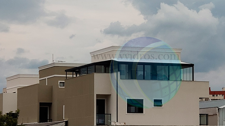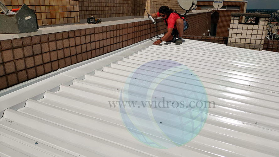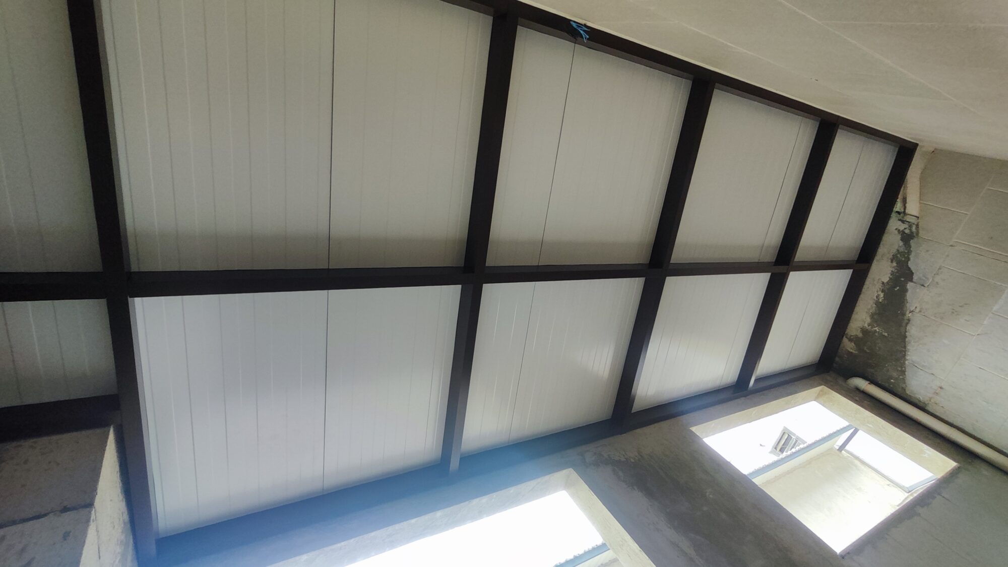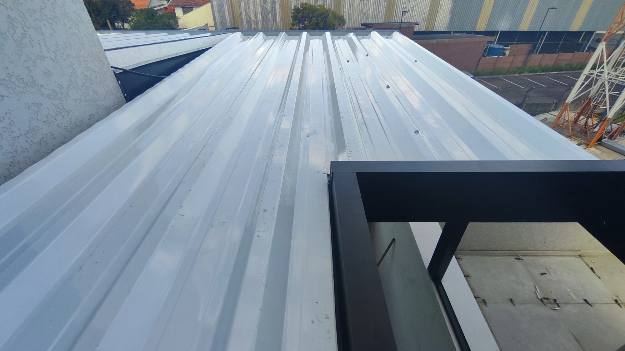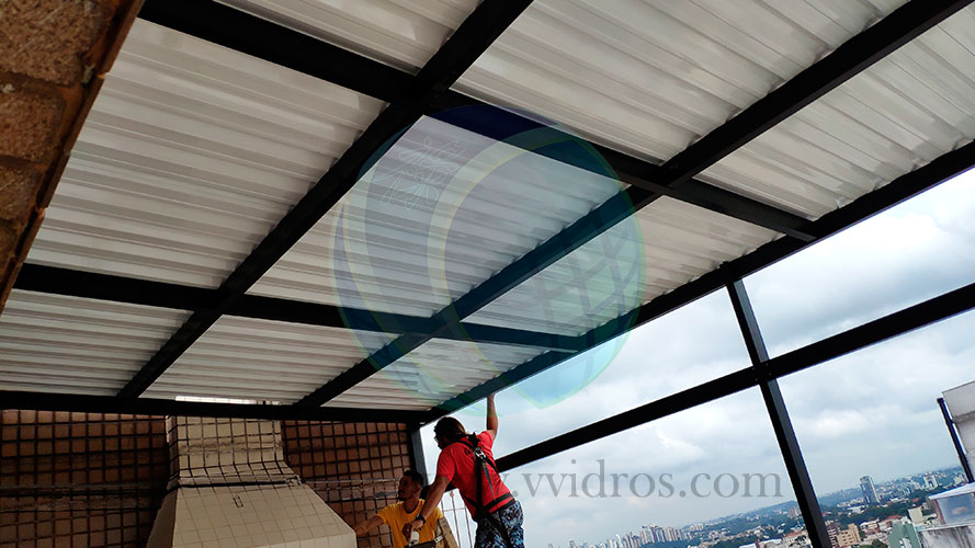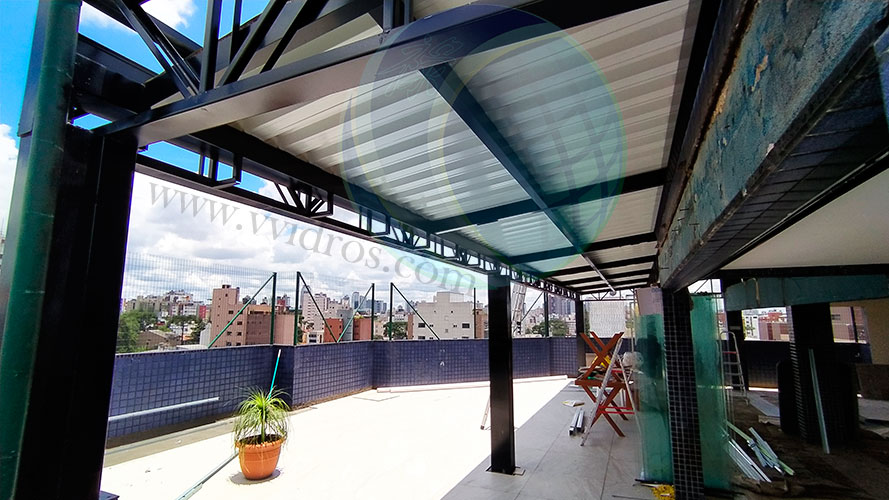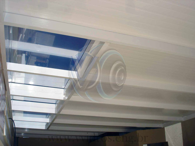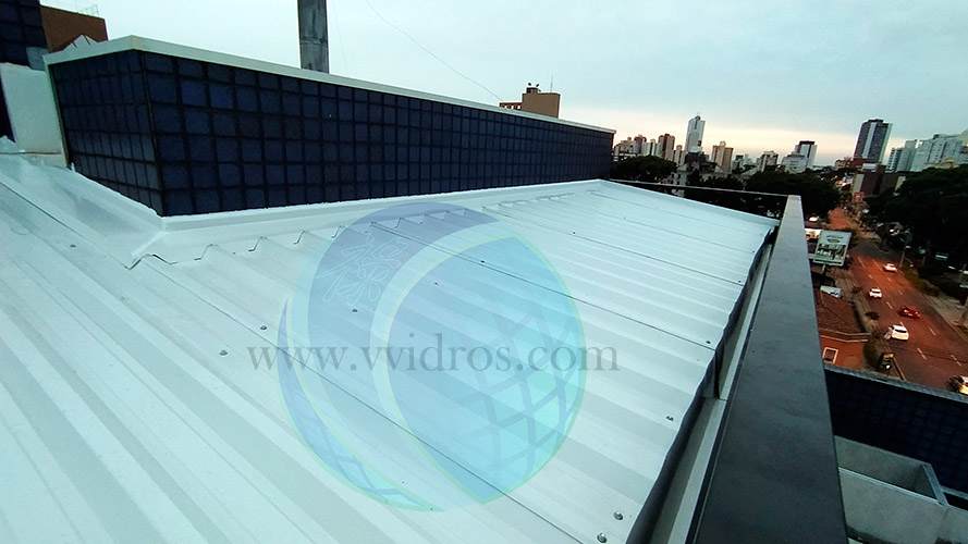 O formato da telha termoacústica é trapezoidal na sua face superior. Na face inferior pode ter o mesmo formato trapezoidal ou pode ser plano. Neste último caso recebe o nome de Telha Bandeja. A VVidros Engenharia sempre trabalha com pintura eletrostática em ambas faces para ficar com o mesmo acabemento e aparência que as estruturas compostas por perfis de alumínio.